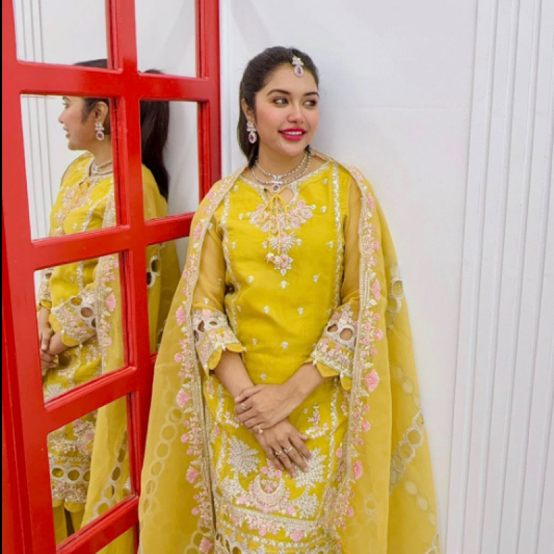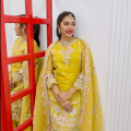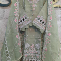 Pure Organza Maslin Embroidery Sequence Karchupi Stone Pearl work Stitch three piece Body - 46, Long - 42
