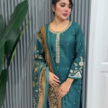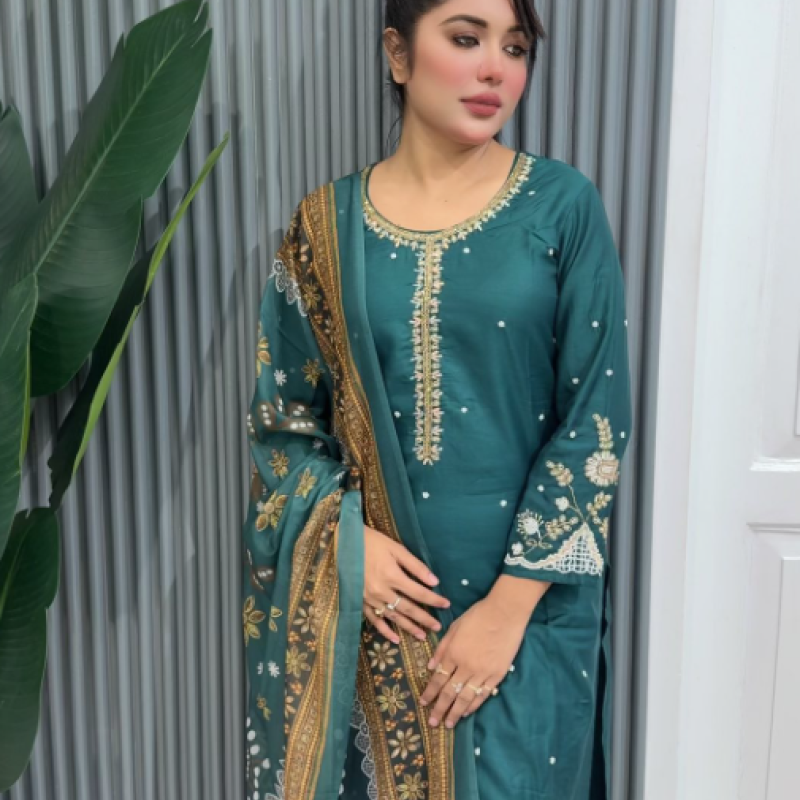 Pure Maslin Cotton Embroidery Karchupi Stone Work three piece/-