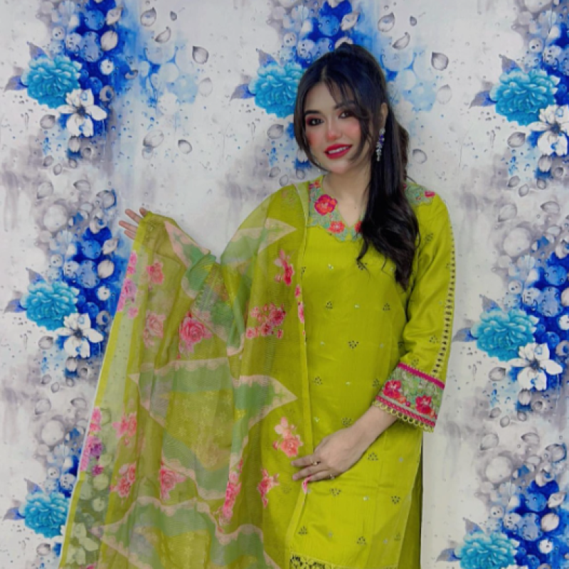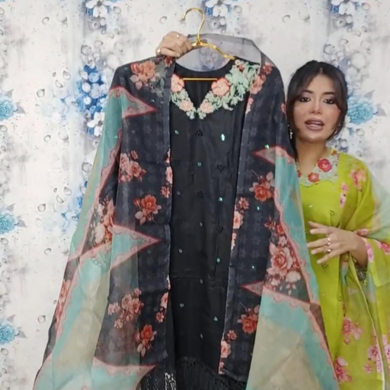 Pure Maslin Cotton Chikenkari Embroidery Sequence Semi Stitch three piece Body - 50, Long - 45