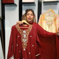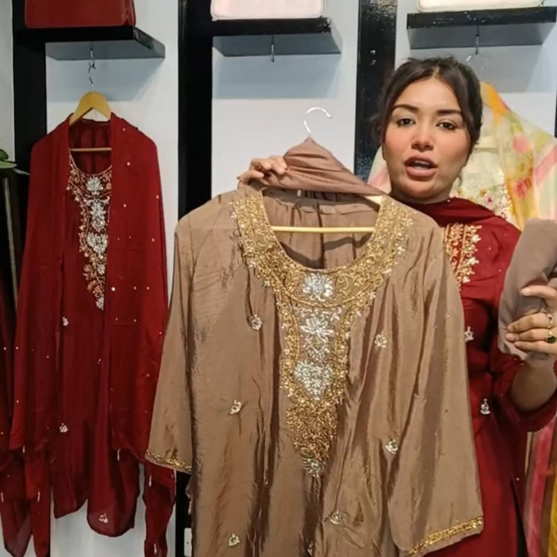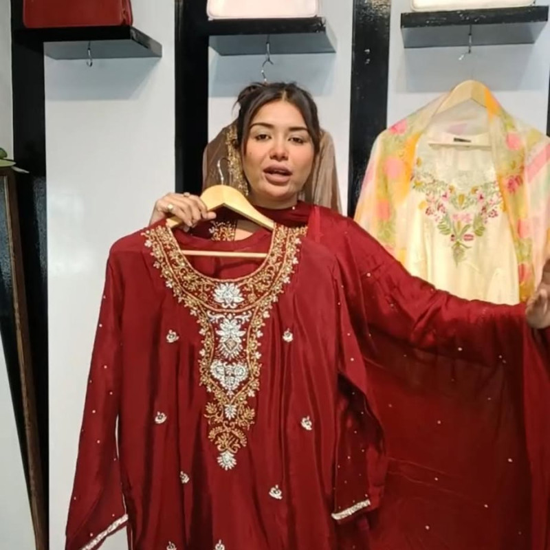 Pure Chinnon Silk Embroidery Karchupi Stone work Semi Stitch three piece Body - 50, Long - 44 /-