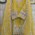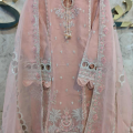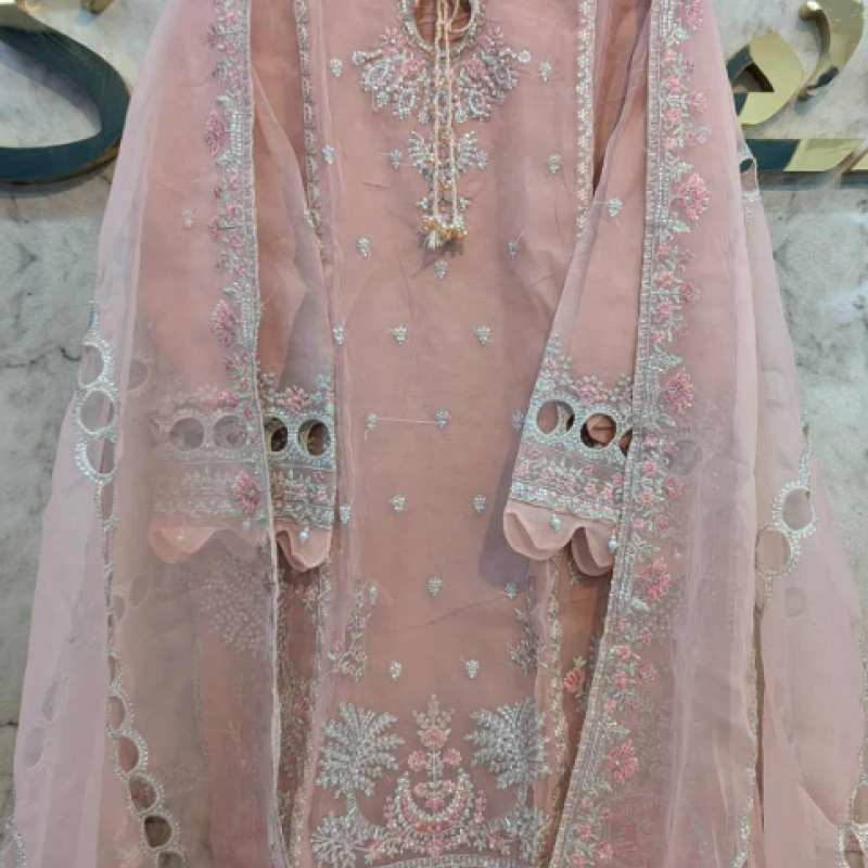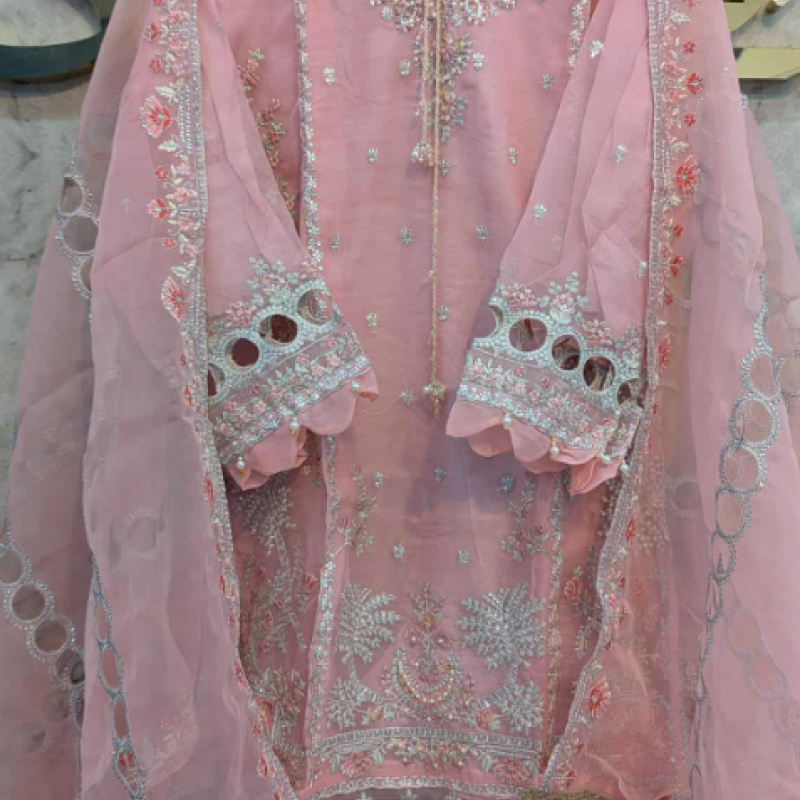 Pure Organza Maslin Embroidery Sequence Karchupi Stone Pearl work Stitch three piece Body - 46, Long - 42