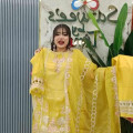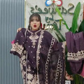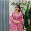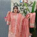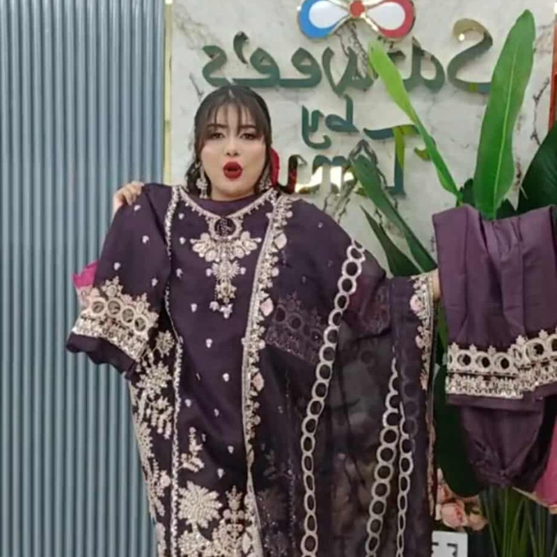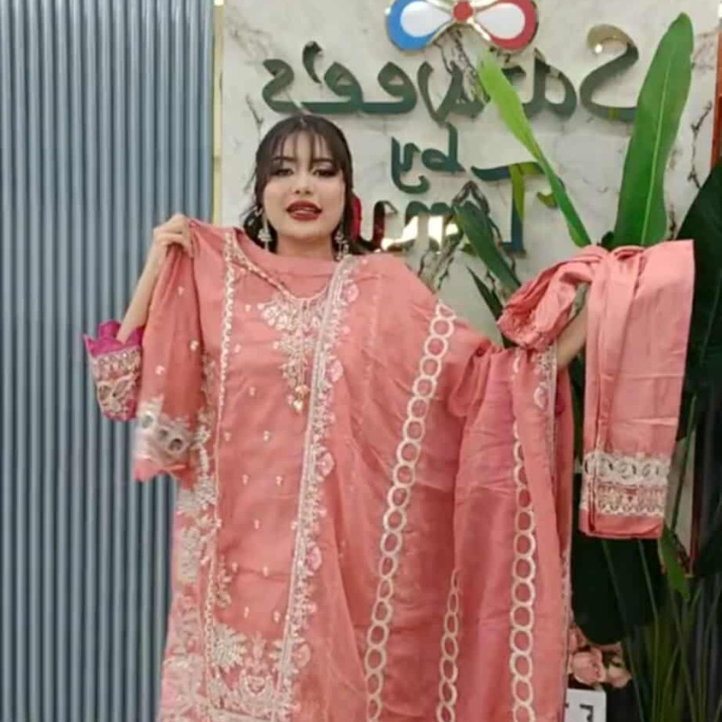 Pure Organza Maslin Embroidery Sequence Karchupi Stone Pearl work Stitch three piece Body - 44, Long - 42/-