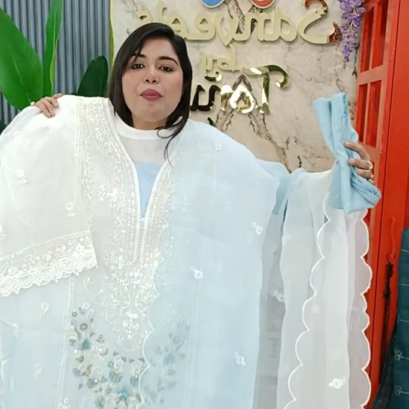 Pure Organza Maslin Embroidery Sequence Inner Attach Semi Stitch four piece Body - 54, Long - 47 /-