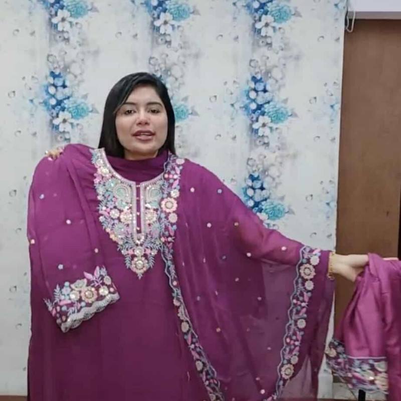Pure Crape Chiffon Georgette Embroidery Sequence Inner Attach three piece Body - 48, Long - 46 /-