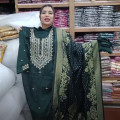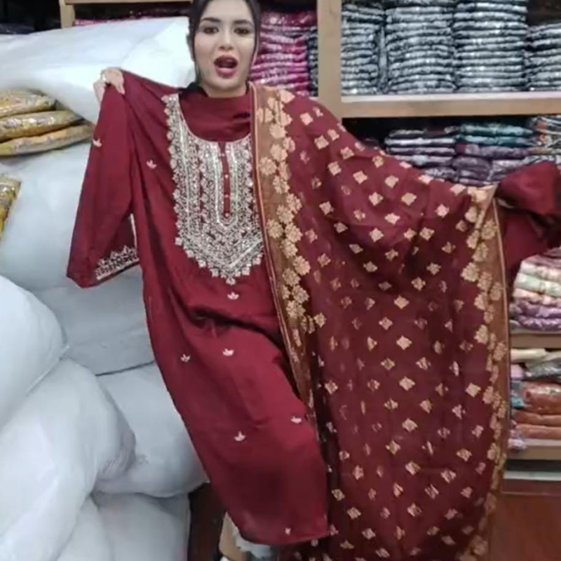 Pure Silk Embroidery Karchupi Stone work three piece Body - 50, Long - 46 /-