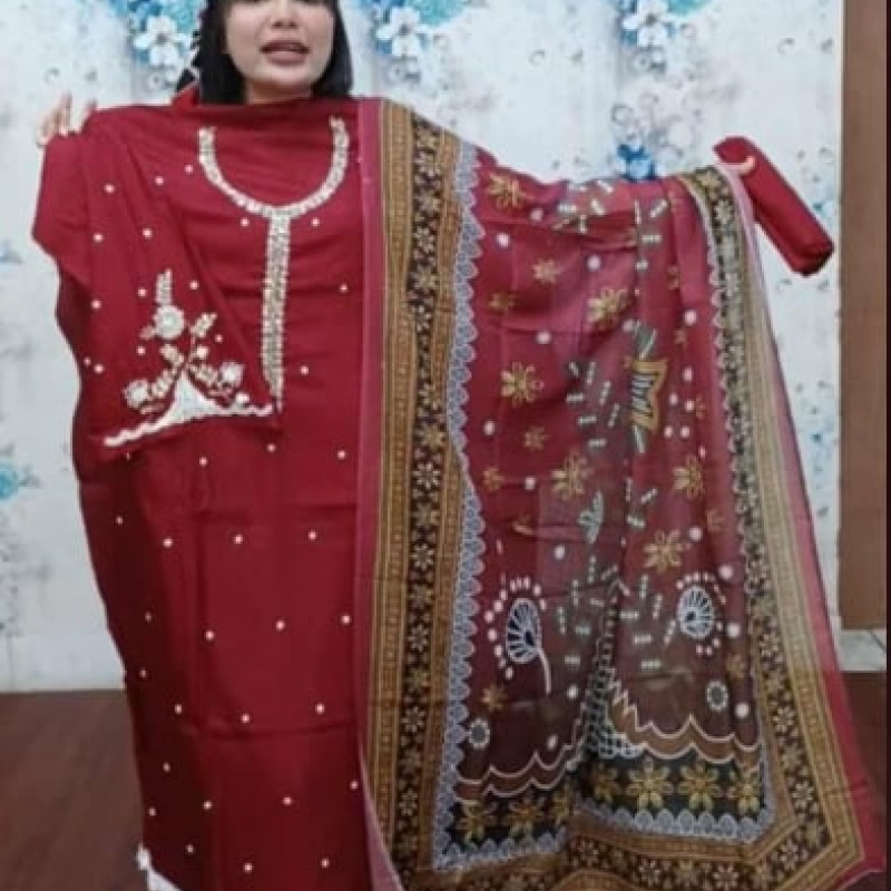 Pure Maslin Cotton Embroidery Karchupi Stone Work three piece/-