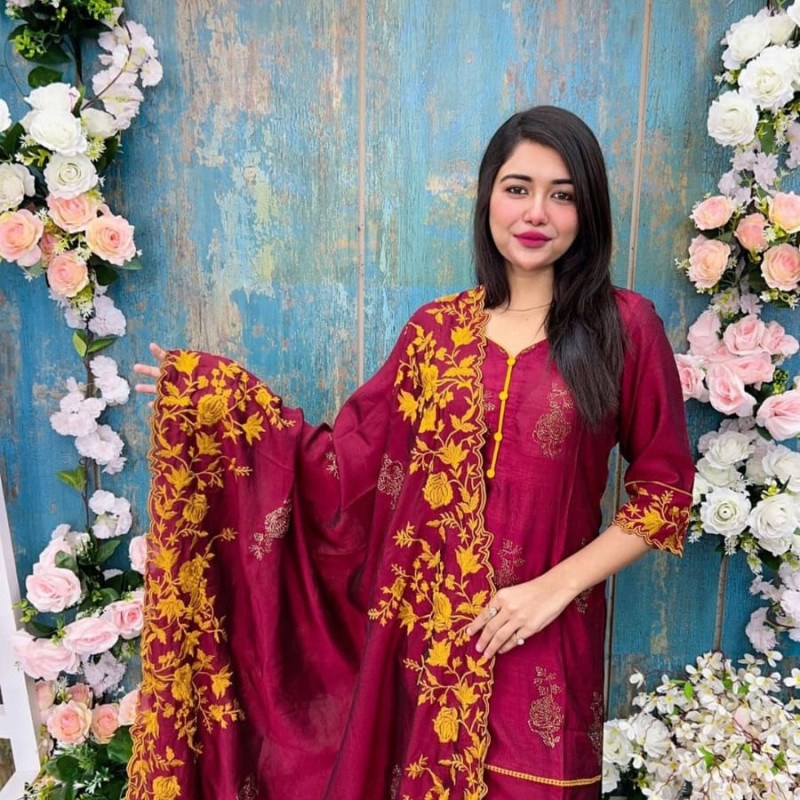 Pure Shimari Silk Embroidery Savoraski Stone work three piece