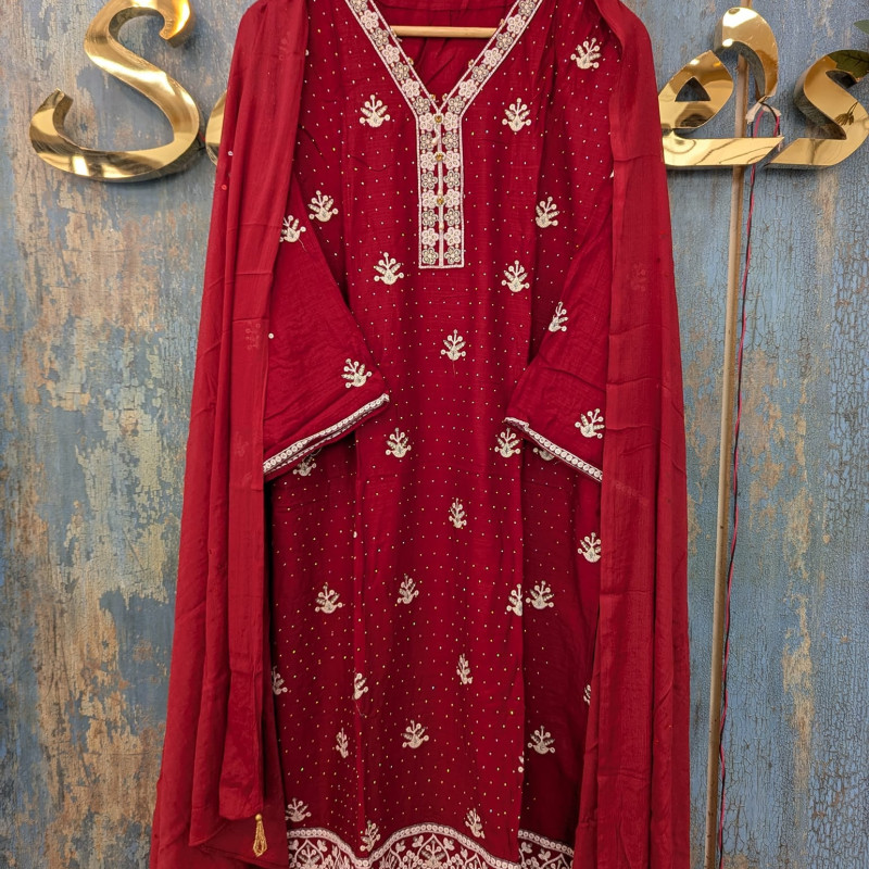 Pure Maslin Cotton Stitch Embroidery Stone work three piece Body - 46, Long - 44